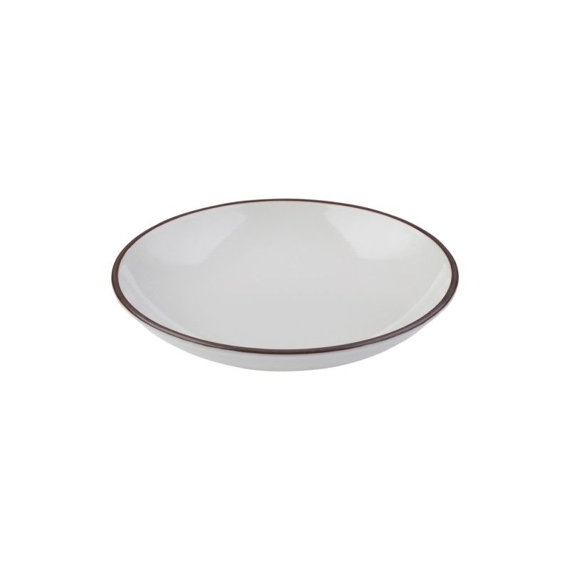Глубокая фарфоровая тарелка 22см, объём 770 мл — подходит для подачи салата, вторых блюд, пасты и дессерта. Тарелка белая с коричневой каймой, она выполнена из профессионального ресторанного фарфора от бренда ID Fine. Отличается прочностью и лёгко штабелируется. Практичное и стильное решение для кафе, ресторанов и гостиниц. Входит в базовую коллекцию Modest. Пожизненная гарантия от сколов.