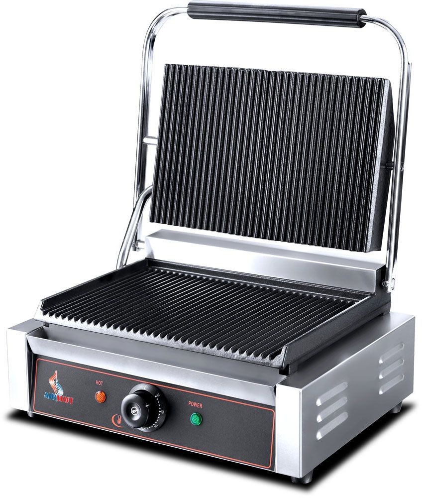 Габаритные размеры : 425х400х220 мм; Мощность : 2 кВт; Напряжение : 220 В; Вес : 17,5 кг; Температурный режим : от 50 до 300 °C; Тип гриля : одинарный; Материал рифленых поверхностей : чугун; Размер рабочих поверхностей : 335х218 мм верхняя, 356х277 мм нижняя; Терморегулятор : да; Съемный поддон : да;