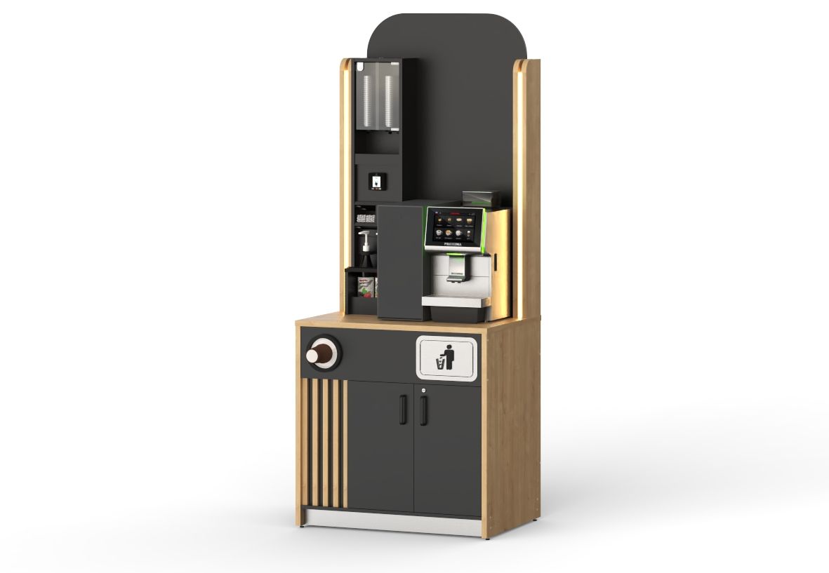 Габариты (ШхГ) : 950х695 мм ; Высота : 2370/950 мм ; Назначение : Кофе-модуль самообслуживания ; Тип : напольный пристенный / островной ; Материал : ЛДСП Egger, нержавеющая сталь, оргстекло, пластик ; Декоры : фото складской программы размещены ниже ; Вес : 90 кг;