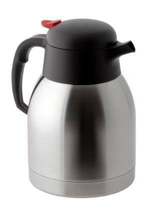 Сервировочные кофейники - специальная посуда для хранения горячих жидкостей. Кофейник с кнопкой предназначен для подачи к столу кофе или чая. Температура жидкости при 75 °С в термосе падает только на 1 °C в час в течение первых 4-х часов. Высота: 21,5 см. Диаметр: 18 см. Вес: 800 гр. Материал: нержавеющая сталь.