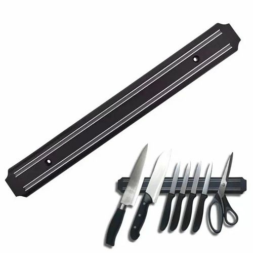 Магнитный держатель для ножей помогает грамотно распределить свободное пространство на кухонном столе. Дизайн аксессуара лаконичный: внешне он выглядит как магнитная планка, которая притягивает лезвия ножей. Изделие надежно крепится на стену, в горизонтальном положении. Такое хранение режущих предметов обеспечивает сохранность качества лезвий, а также устраняет риск касания их друг с другом. Ножи крепятся надежно и не соскальзывают. Изделие выполнено из нержавеющей стали, материала, который не ржавеет, не тускнеет и долгое время не теряет первоначального внешнего вида. Материал: нержавеющая сталь, пластик.