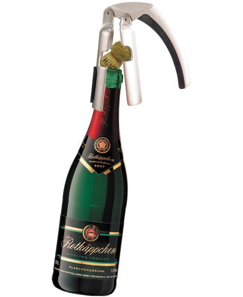 Открывалка для шампанского — специальный инструмент для извлечения пробок из бутылок с шампанским. Пробка фиксируется в специальном отверстии между двумя концами и одним движением извлекается из горлышка. Материал: нержавеющая сталь, пластик.