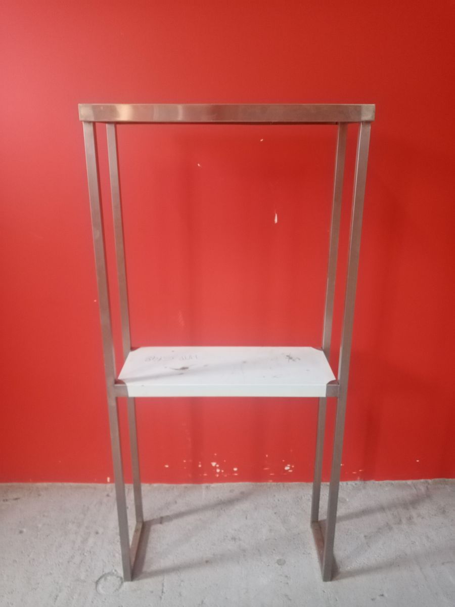 Состояние товара : новый; Причина уценки : без упаковки; Полка : настольная сварная из нер. стали, 2-х уровневая ; Габаритные размеры : 700х300х1500 мм; Особенности : внизу ног перемычка из трубы по стороне 300 мм;
