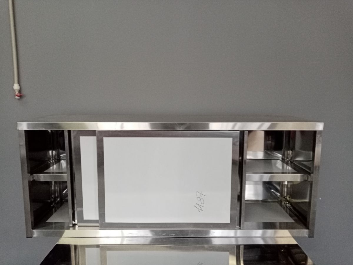 Состояние товара : новый; Причина уценки : без упаковки; Материал : нерж. сталь AISI430 сварной; Габаритные размеры : 1500х400х600 мм; Двери-купе : да; Дно + 1 сплошная полка : да;