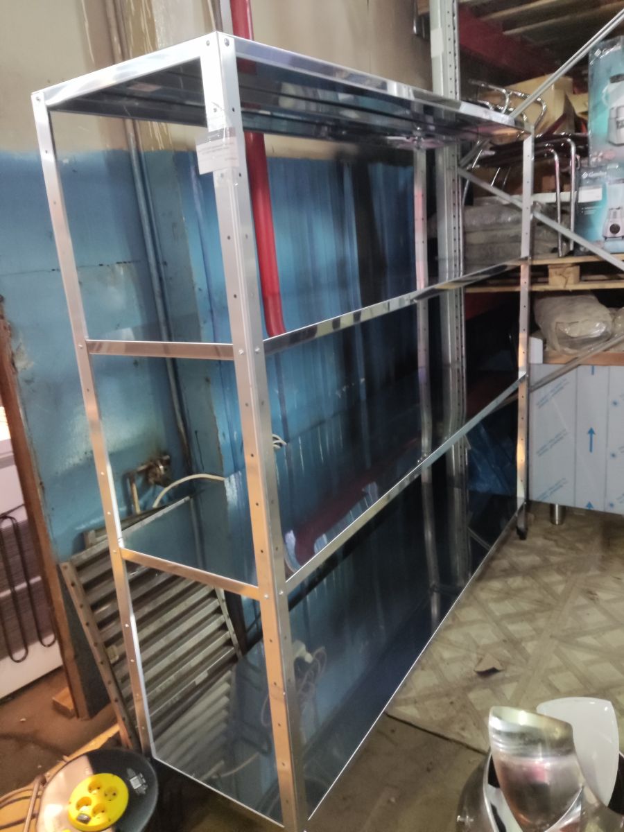 Состояние товара : новый; Причина уценки : без упаковки; Тип полок : сплошные ; Количество полок : 4 ; Материал каркаса : нерж. сталь ; Материал полок : нерж. сталь; Габаритные размеры : 1900х500х1800 мм; Страна производства : Россия;