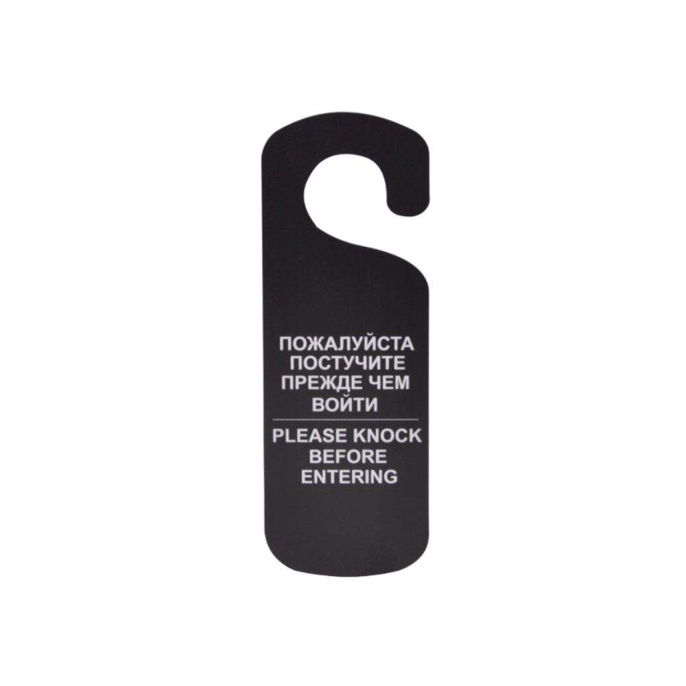 Табличка на ручку двери Постучитесь пожалуйста прежде чем войти черная размером 90х250 мм выполнена методом уф-печати на пвх 3 мм. Применима в гостиницах и других общественных помещениях